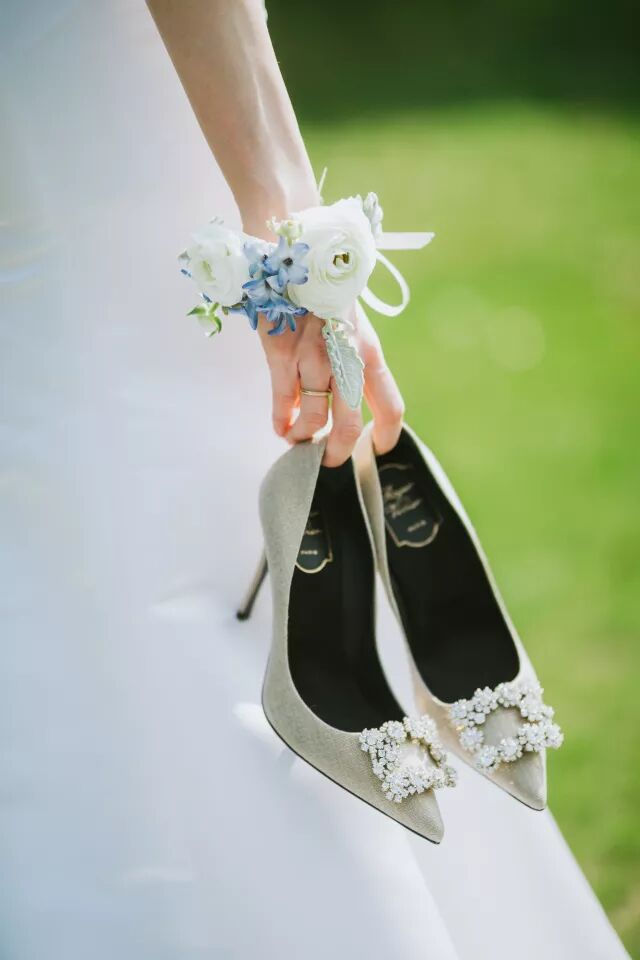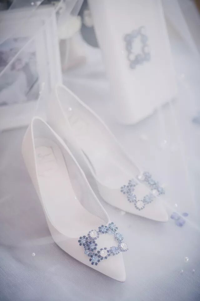 纯白缎面鞋身搭配浅蓝、深蓝渐变层次感花钻扣,仿佛在新娘足尖盛开的一簇蓝花~