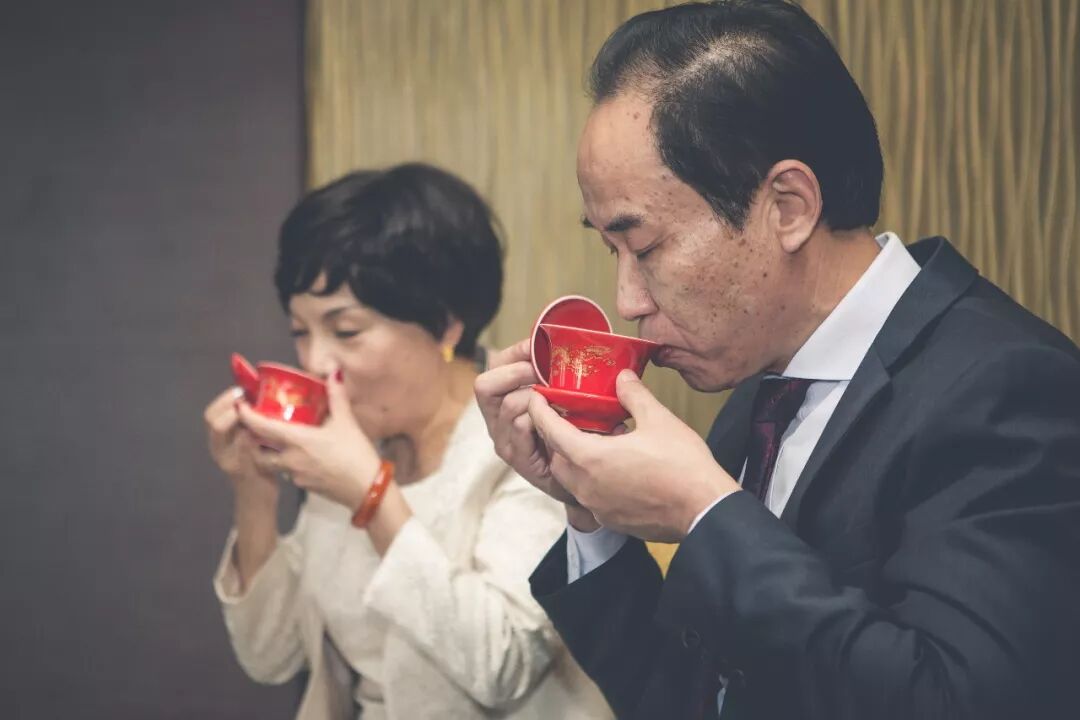 新人恭敬地来到双亲面前,双手敬献自己亲手泡制的香茶,演绎出一段别具匠心的礼仪佳话。