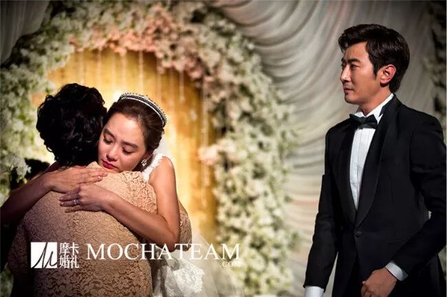 “妈妈还从来没见过你穿过婚纱的模样,只能把婚纱拿起来在你身上比划两下,想象下待会你是怎样美丽模样,可别自己认不出了呢。”