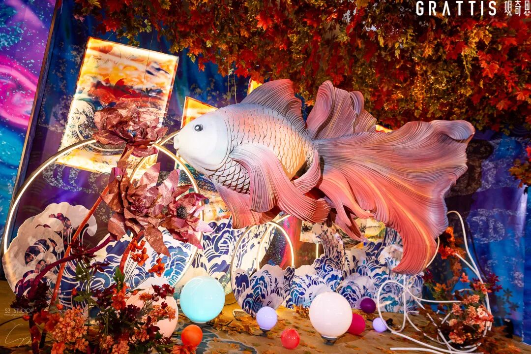 浮世绘经典的海浪元素与灯管组合,镜面、五彩的发光球将迷幻氛围营造的更为透彻,流动的色彩肆意涌动。