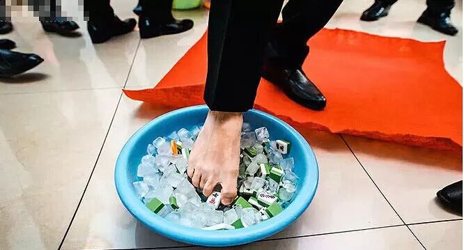 把冰块里的麻将用脚夹出来,拼成 I LOVE YOU 的形状!!