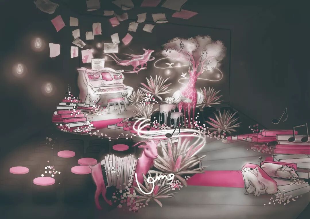 新郎喜爱音乐,新娘擅长绘画。于是,设计师将二者相容:音乐中的意境,能被画笔绘出,笔触里的旋律,能被音乐谱写。