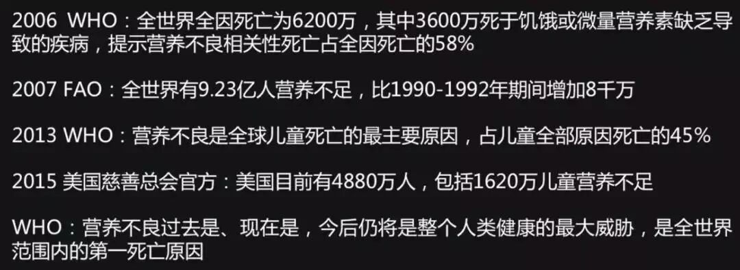 世界卫生组织(WHO)明确表示:营养不良过去是、现在是、未来仍将是全世界范围内的第一死亡原因。