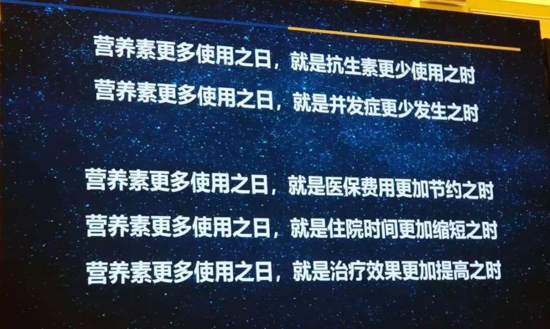 营养素更多使用之日,就是抗生素更少使用之时;营养素更多使用之日,就是并发症更少发生之时;营养素更多使用之日,就是医保费用更加节约之时;营养素更多使用之日,就是住院时间更加缩短之时;营养素更多使用之日,就是治疗效果更加提高之时。