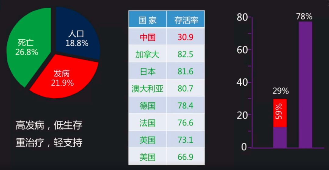 我国总人口占全世界的18.8%(不足五分之一),但是我国的肿瘤患者占全世界的21.6%(超过五分之一),我国的肿瘤死亡人数占全世界肿瘤死亡的26.8%(超过四分之一),说明了我国肿瘤治疗高发病、低生存的现状。