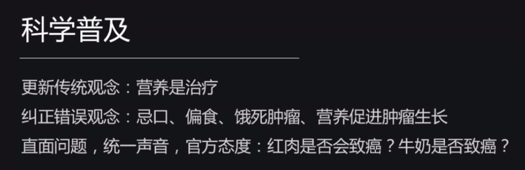 2、纠正错误观念。如忌口、饿死肿瘤、偏饮偏食等大众误区,没有任何证据表明营养治疗促进了肿瘤的生长,相反营养治疗可以有效的抑制肿瘤的生长。