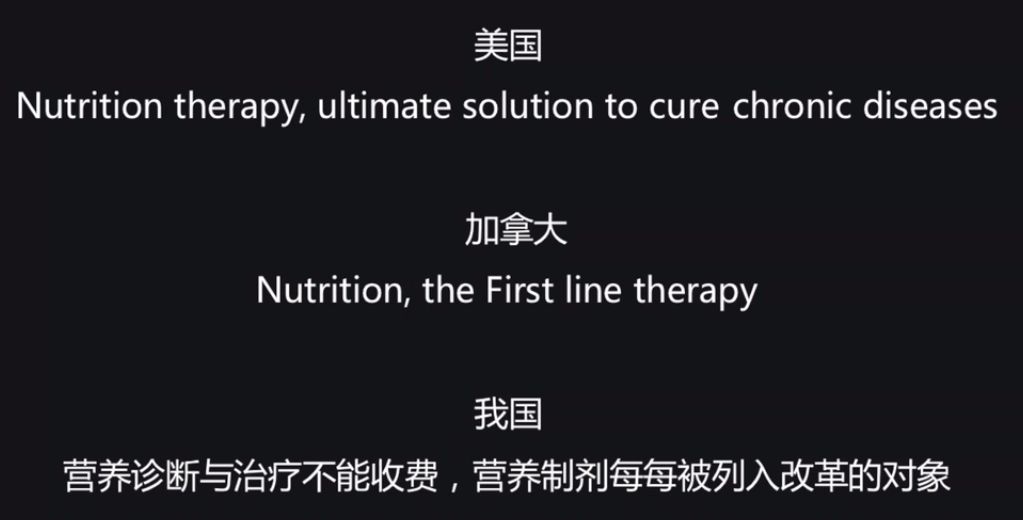 美国于上世纪80年代表示,营养治疗是治愈慢性病的最终解决方案。加拿大在2000年将“营养是一线治疗方案”方案列为国策。而时至今日我国的营养治疗仍没有纳入医疗收费系统,且营养制剂常常被列为医疗改革的对象,普遍认为它只是辅助药物,可以删除掉。