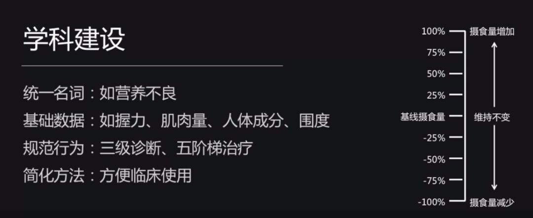 3、规范行为。诊断上遵循三级诊断:一级诊断,营养筛查;二级诊断,营养评估;三级诊断,综合评价。治疗上遵循五阶梯原则:第一阶梯,营养教育;第二阶梯,口服营养补充;第三阶梯,全肠内营养;第四阶梯,肠内营养加上补充性肠外营养;第五阶梯,全肠外营养。