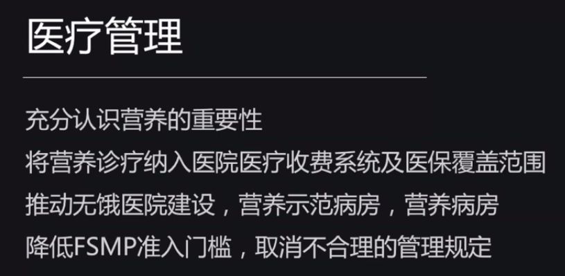 1、充分认识营养的治疗作用。从国家层面认识到营养是治疗,是和手术、放疗、化疗一样的另一个疗法,是基础治疗方法。