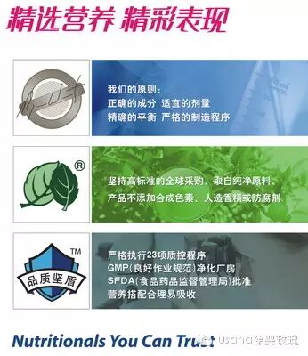 在“USANA 葆婴”营养品的外包装上,人们可以看到 3 个特别的标志,这是“USANA葆婴”对于产品原料、配方和生产质量的庄严承诺: