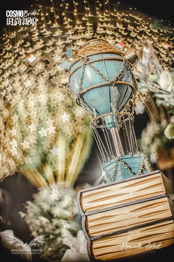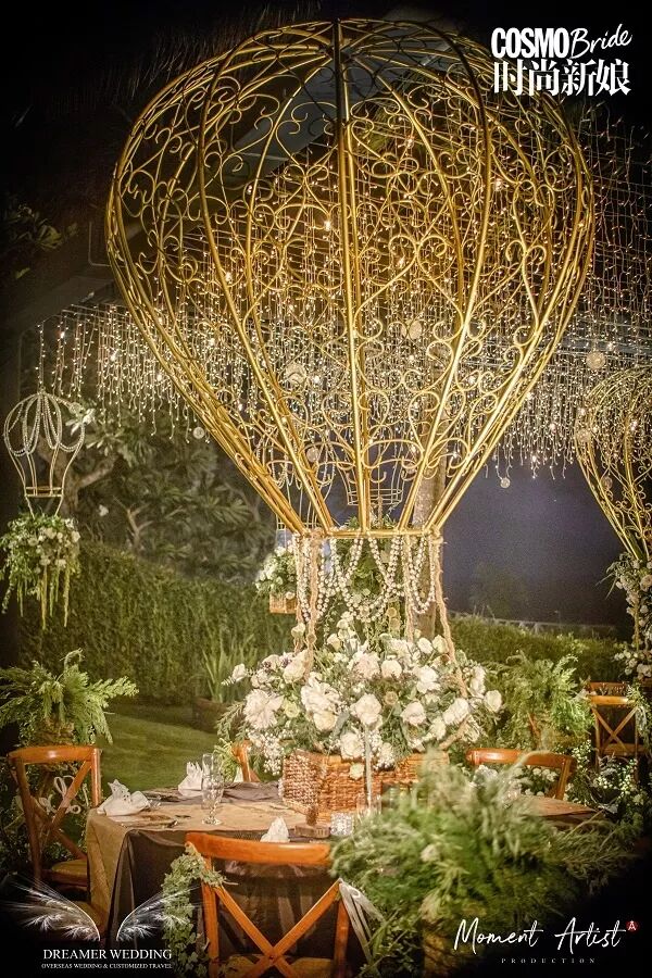 热气球造型的线条装饰让婚礼的晚宴环节充满了童话色彩,简单的白色鲜花与星星灯点缀其中,让现场看起来更加唯美浪漫。