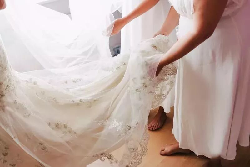新娘穿着婚纱,特别是长拖尾时,行走很不方便,所以伴娘应该适时给新娘整理裙摆。