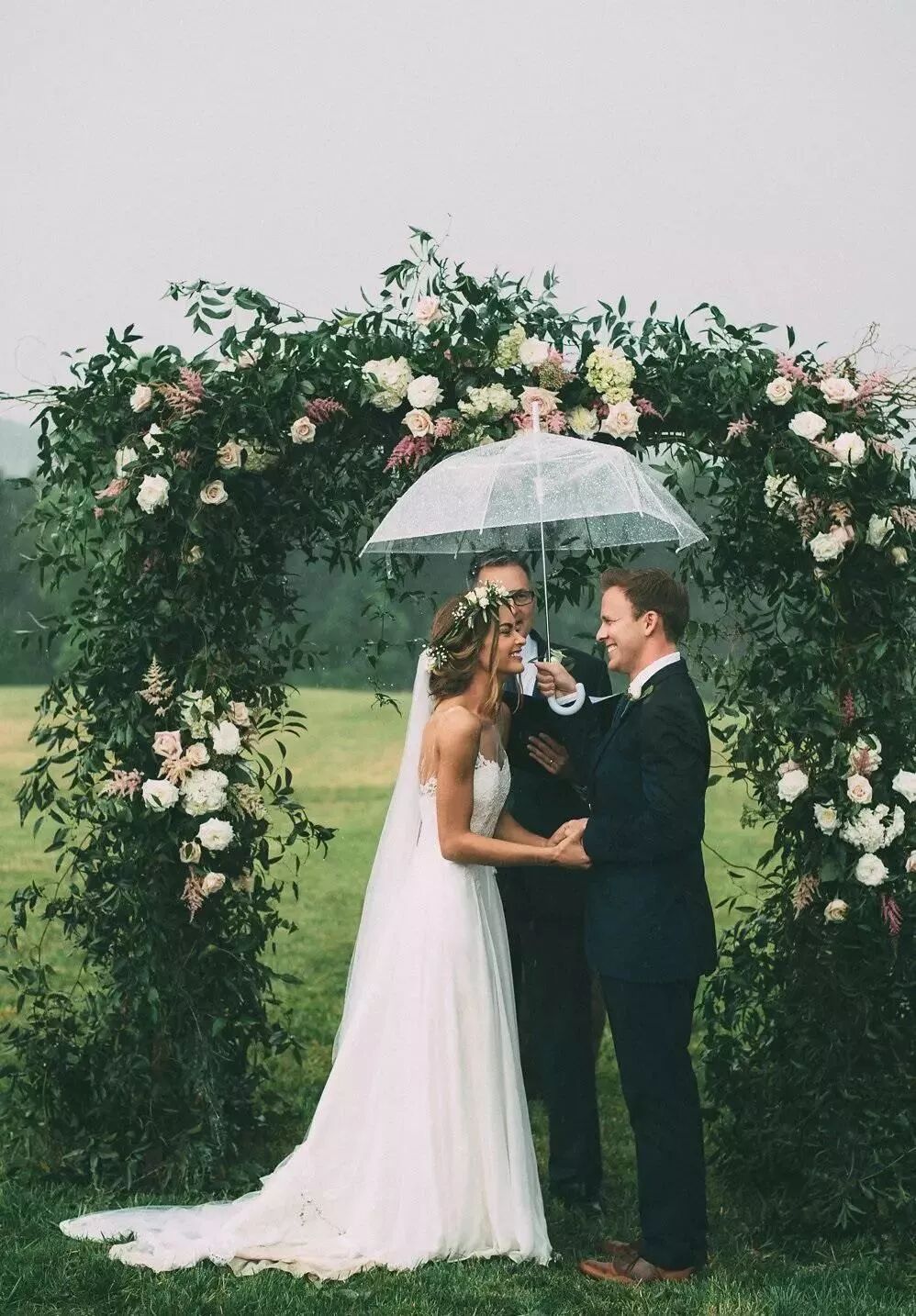 如果婚礼当天下雨了,只要不是很大的雨,新人也别气馁,淅淅沥沥的小雨中举行婚礼也别有一番味道。所以事先准备雨伞是很重要的。最好准备无色透明的雨伞,这样不仅可以增添浪漫气氛,拍照也会很漂亮。