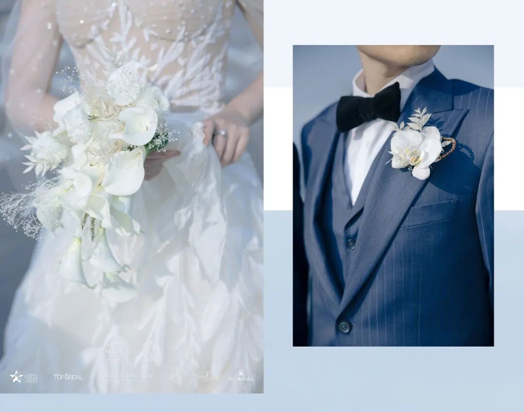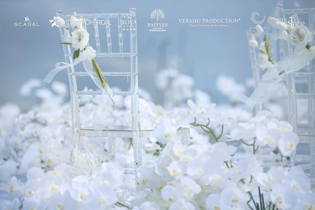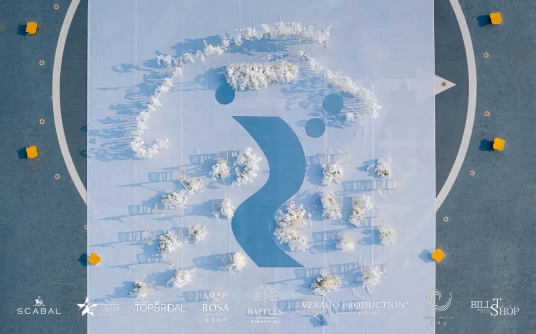这场婚礼秀是在高度350米的停机坪举行的,只有最单纯的色彩才能唤起最强烈的心灵感受力,所以现场布置选择了白色为主色调,让我们一起回归爱情最本真的状态,摒弃五颜六色的浮华。
