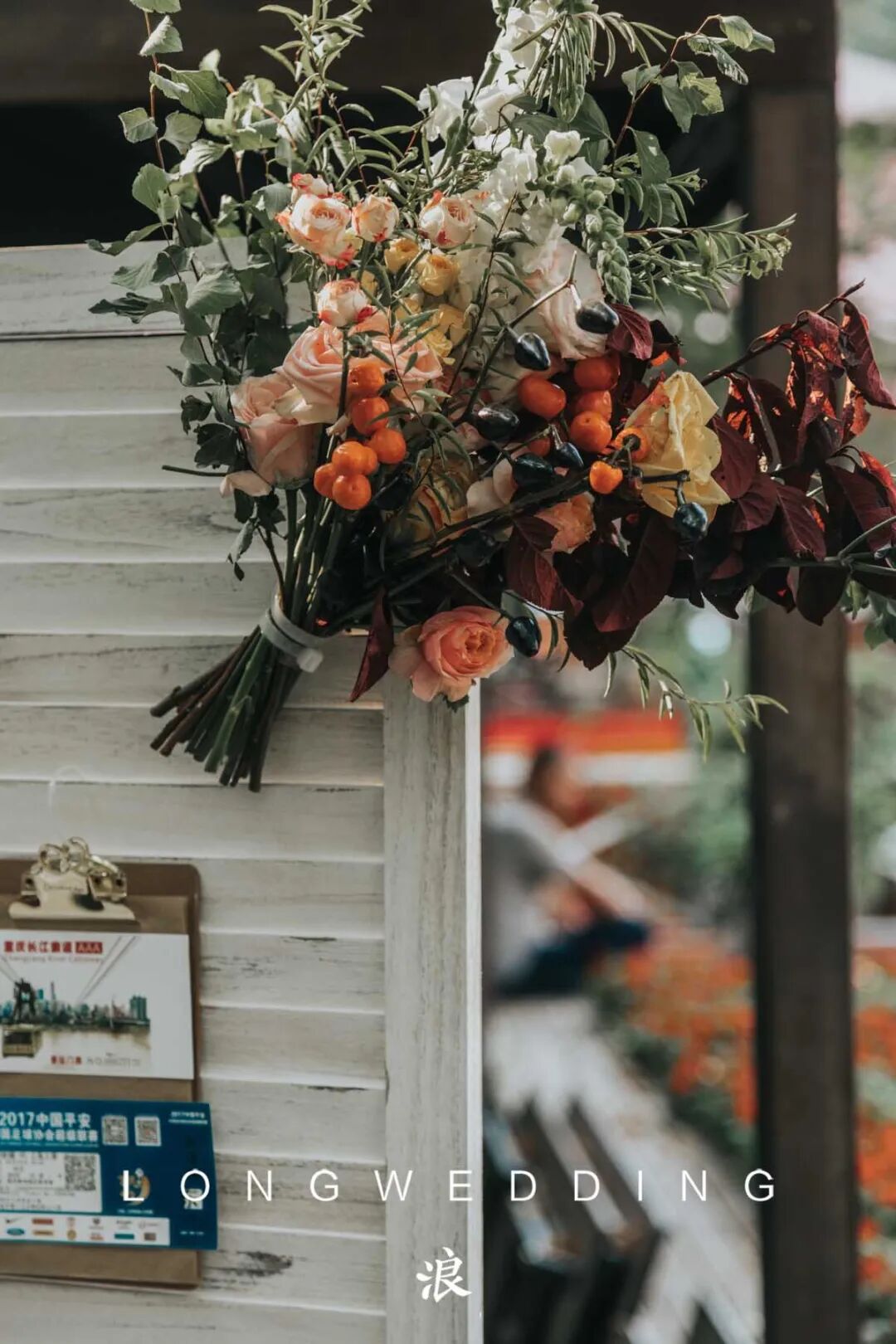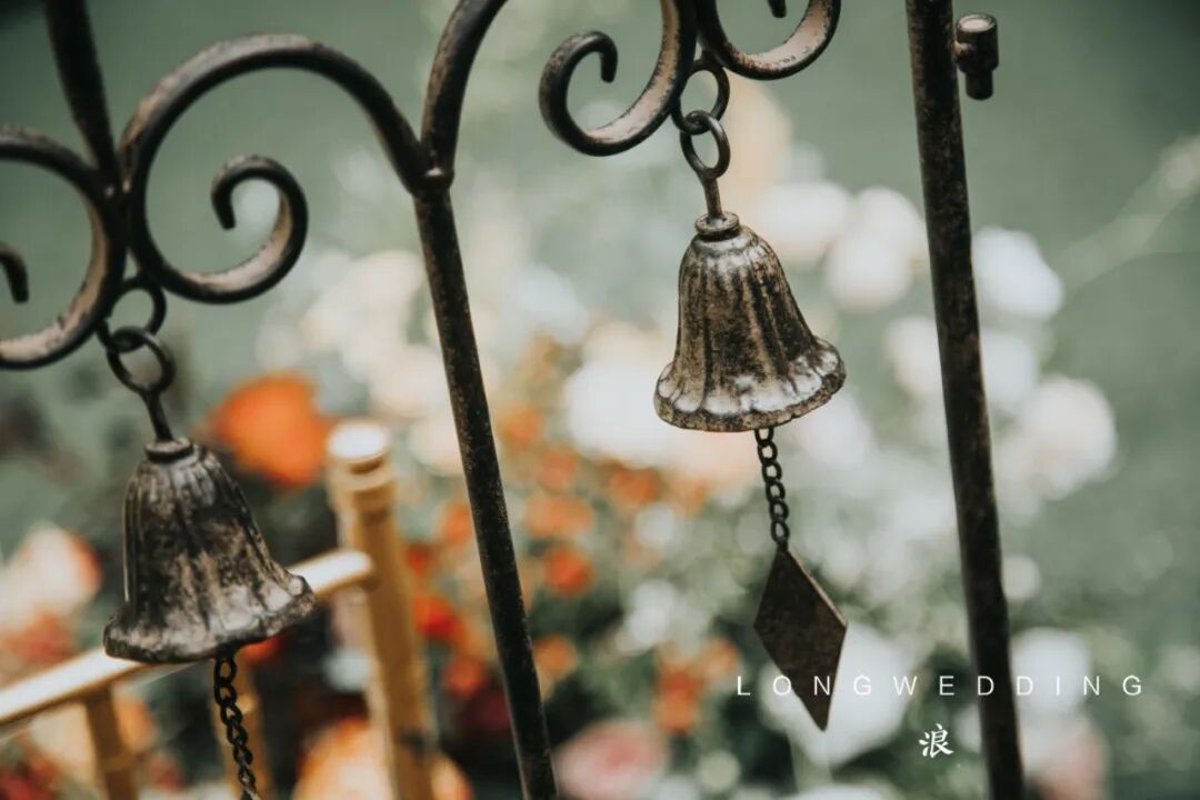 入场处做旧的铁艺栏杆上,挂着精致的小铃铛;甜品区木制屏风上,是新娘精心收藏的恋爱期间的各种票据;很多地方都有着手写的新人英文名字;最有趣的是新娘的手捧花中,藏着一株斑克木,因为新郎是从事播音主持工作的,而斑克木的形状刚好像一只话筒。