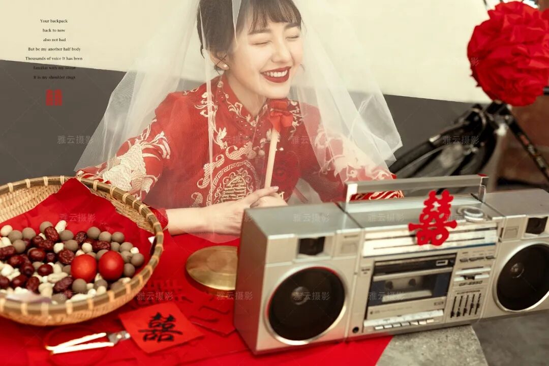 婚礼也随之变得开放和时髦。西装、旗袍、婚纱各种混搭比比皆是,为了喜庆,所有的东西都要戴上大红花。新娘穿起了婚纱,戴起了头纱,手上捧着时下最流行的花。