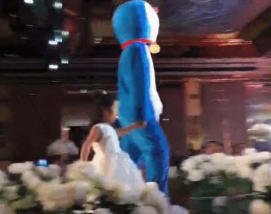 此时,只见婚礼大门被重重地推开,身穿快递服的小哥一个凌波微步,风风火火地送来了戒指。
