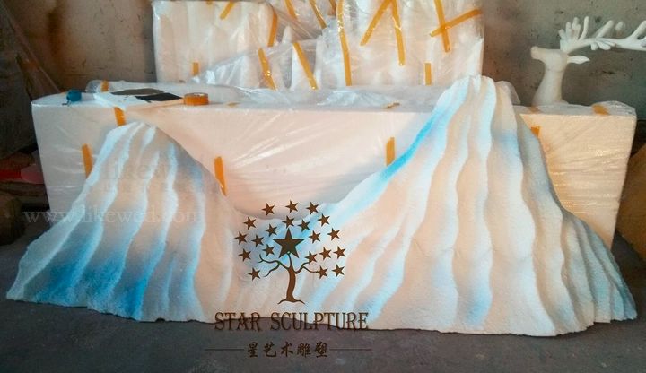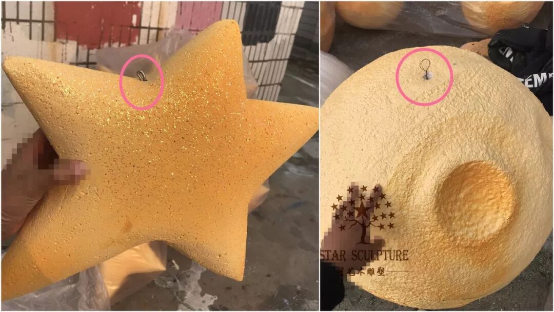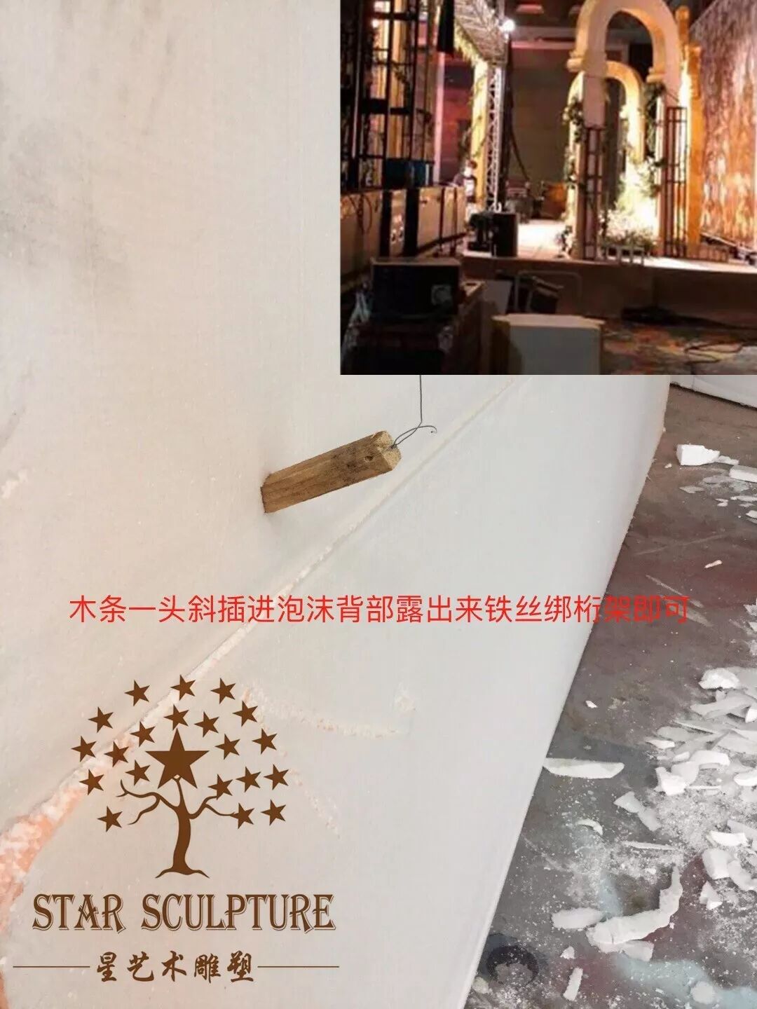 因为物流运输限制,大型的背景泡雕都会切割下来,在安装的时候,切割的地方其实不需要粘起来,星艺术采用高温铁丝切割,缝隙几乎为0.1mm,这个时候竹签就派上用场啦,从后面把切割的2块斜插起来即可。