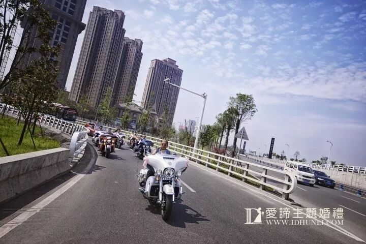 反传统:新娘乘新郎驾驶的哈雷而不是通常结婚所乘坐的轿车去举行仪式的酒店。