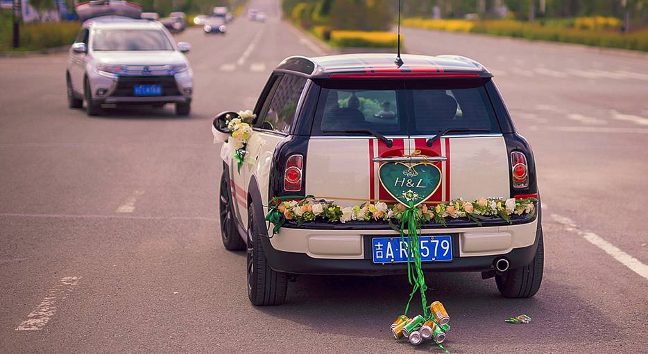婚车:把婚车装饰的重点放在后面,你会有意外的惊喜。