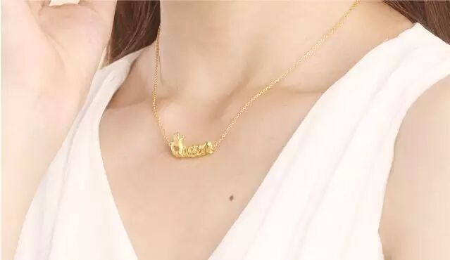 如果穿白婚纱的话,金色会显得很突出,所以,要么不戴金项链,要么新娘可以在鞋子、头饰、捧花上增加金色,形成一个呼应搭配。当然,最好选择雕花的细小金项链的那种。
