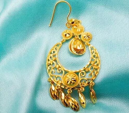 金耳环的选择也要根据你的着装。中式礼服的话,金耳环可以任意选择你喜欢的款式。下图这样,款式比较大、样式复古的,就只适合中式礼服或穿敬酒服时。
