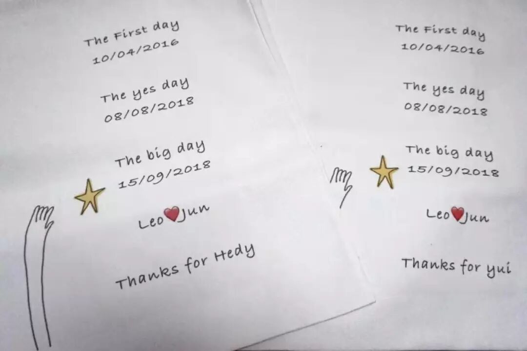 除了上面给大家说的这些专属定制,还有很多新人总结下来的创意:整场婚礼的纸品定制、与两个人名字和贴画的定制饮料、绣字头纱、Q版人形立牌、定制戒托、情侣版结婚手机壳、情侣对杯……