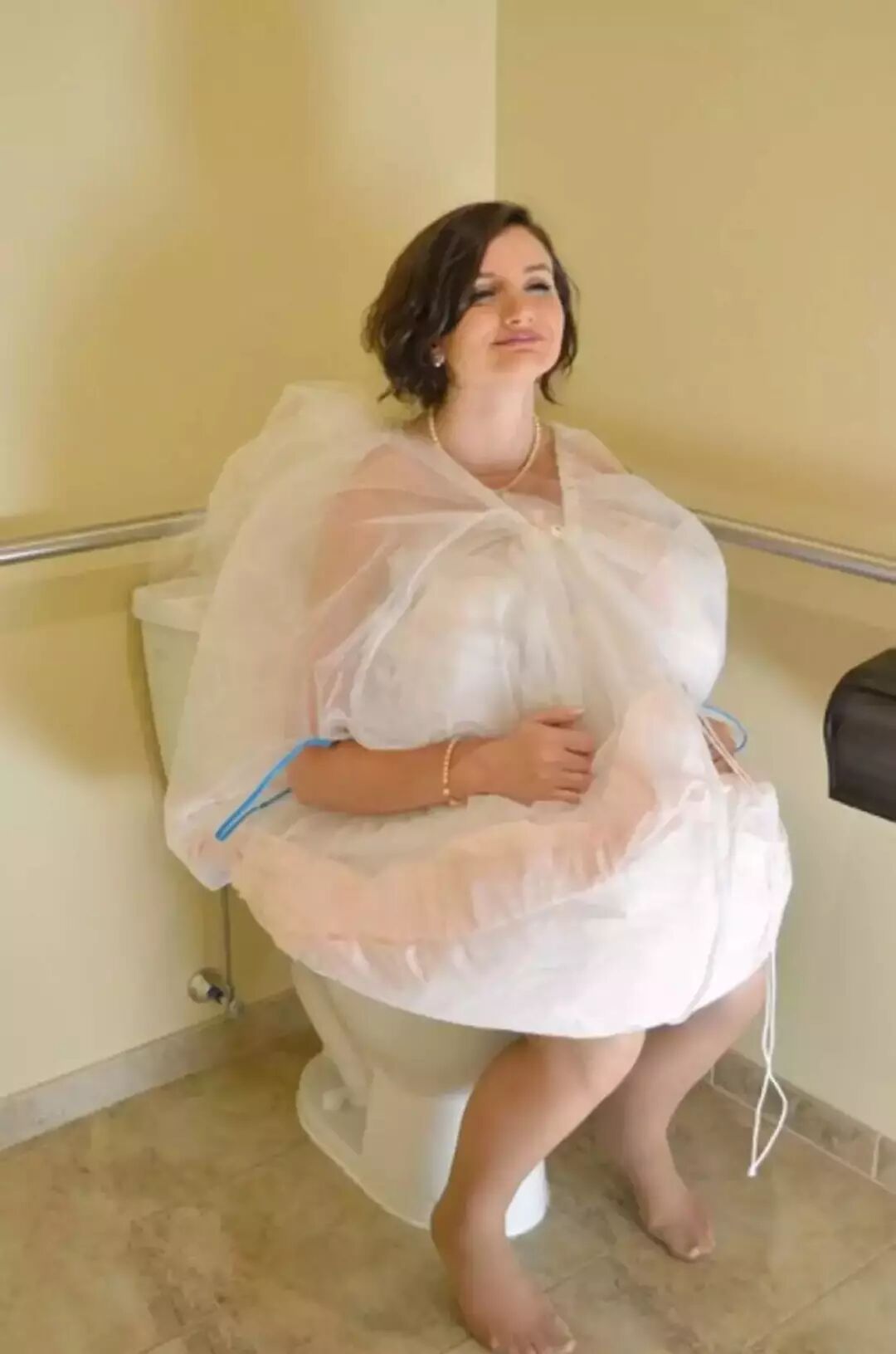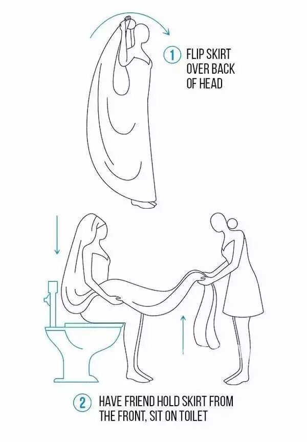 把裙子后摆从身后掀起来弄到头上,再请伴娘帮你拎着前面。