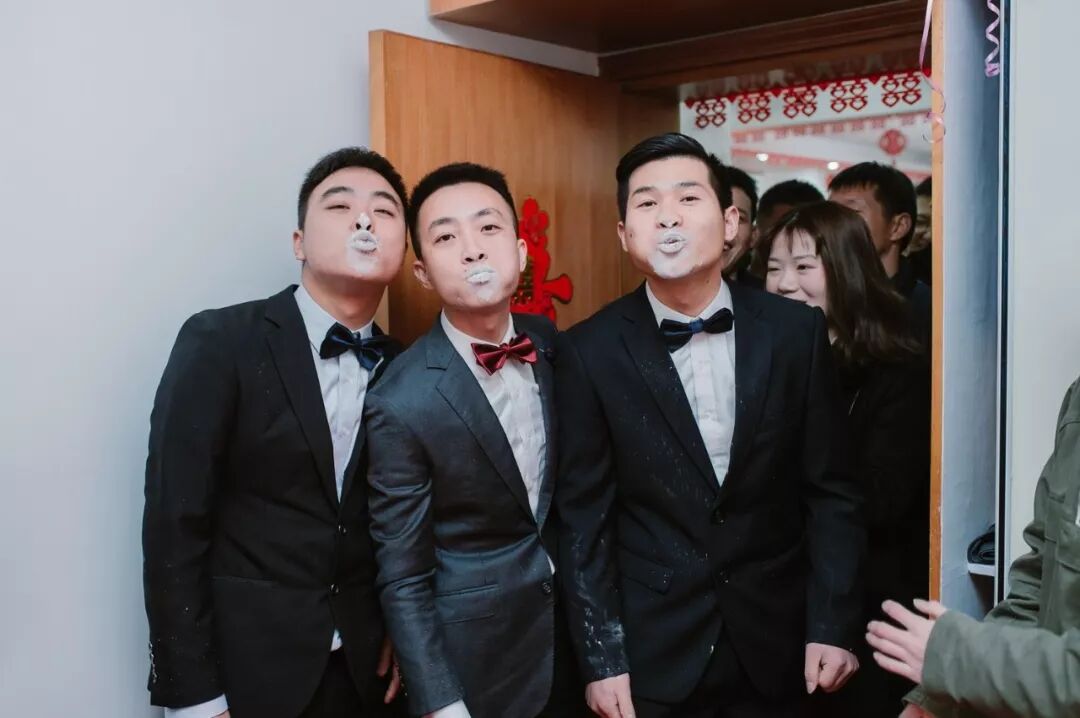 这其实是玩面粉游戏里的一个升级版,以前都是让伴郎们在面粉里找东西,但这种有互动的面粉传递其实更有看点!