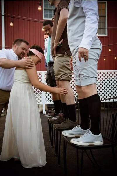 新郎混在伴郎团中,蒙上新娘的眼睛,让新娘通过触摸手、胳膊、胸或小腿辨别哪个是新郎。考验夫妻二人默契的时候到了哦~(一般是新娘摸新郎伴郎们)