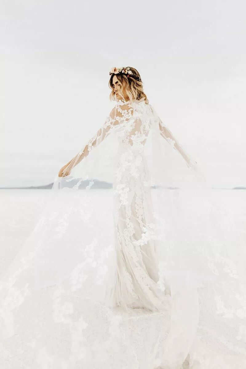 初春的天气还是稍微有些凉意,在户外拍外景的时候加一件这样的披肩刚刚好,蕾丝和白纱都可以考虑~