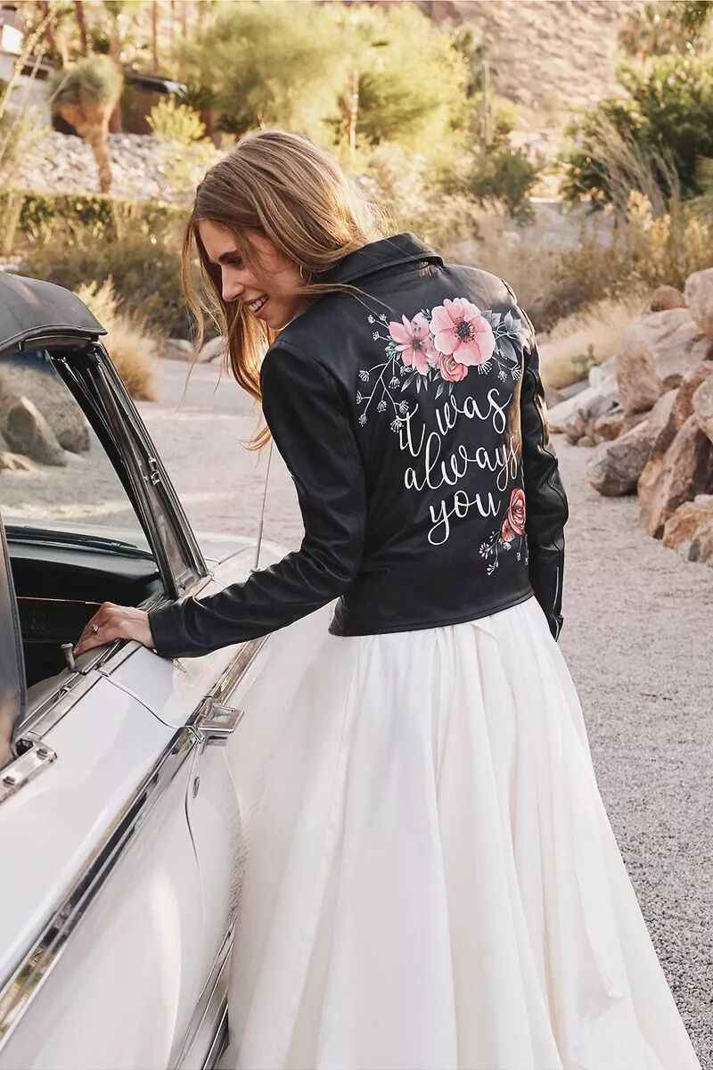 牛仔外套和皮质外套是秋季婚礼披肩的最佳选择,如果你崇尚自由、喜欢机车元素,那你一定要选择一件这样的外套,非常彰显你的个性哦~