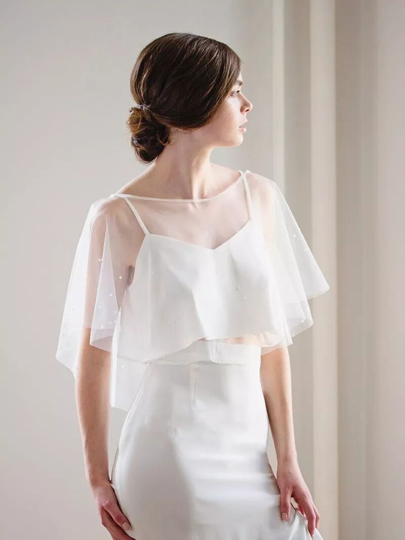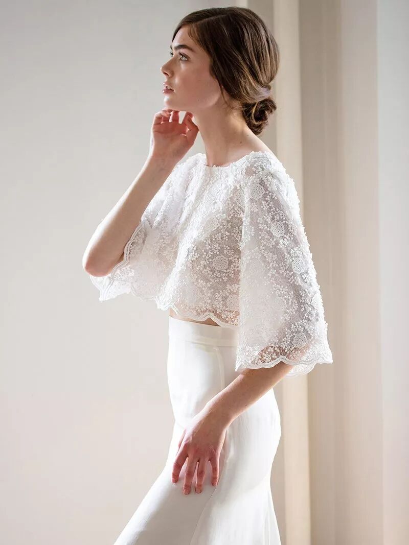 披肩外套已成为时尚新娘展现个人特色的重点配件之一,除了保暖以外,还有修饰手臂和添加多一种伪婚纱造型的视觉效果。
