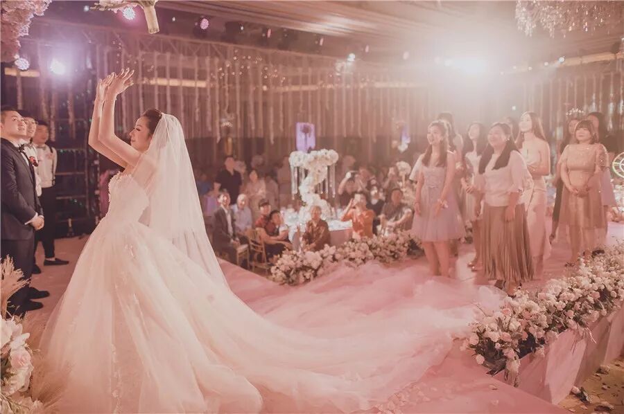 新娘面带微笑,稍微用力地将花球向高处靠后的位置抛出即可,动作幅度不要过大。这样不仅显得优雅,捧花的弧线也会更美哦。