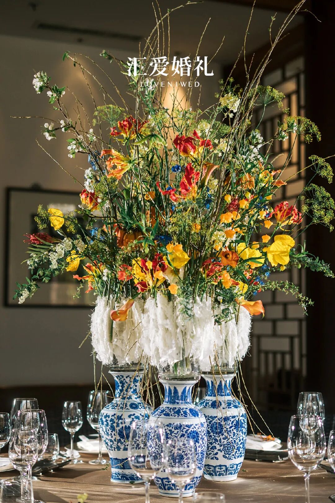 花艺师以此入手,选用色块相对统一,质感温暖,但相对轻盈的小丽花、干支梅等花材,借助暖性曲线及发散线条结构,采用半开放式插花手法做花艺装饰。