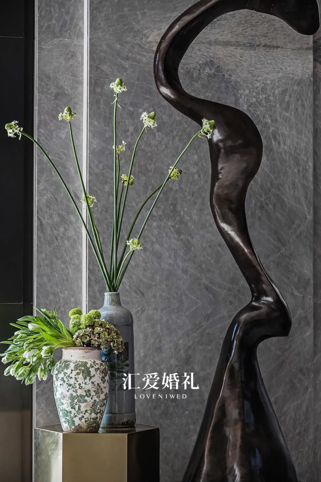 少一点灿烂夺目的绚丽,多一丝柔美宁静的牵绊,浅雅的冷灰调与精致的手工花艺呈现形式尤其相配,触动人心深处的喜悦和静谧。既雅致又光彩焕发,如同飘逸在云端一般。