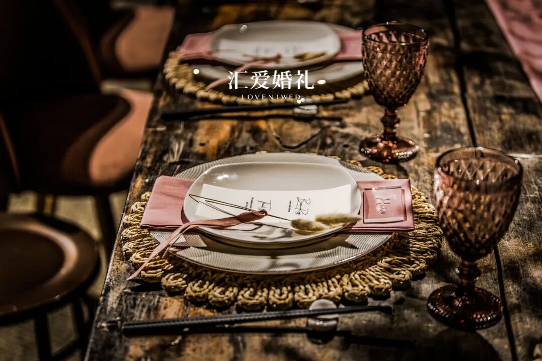 在此基础上,座椅、器皿、餐盘装饰,每一处细节的搭配与选择,都从色彩、材质、质感做层层精细考量,力图在宴会装饰与场地自身的艺术气息中,实现一种微妙的平衡——保留场地原有古朴厚重气息的同时,避免整个空间过于沉闷,营造轻松舒适的婚礼宴会氛围。