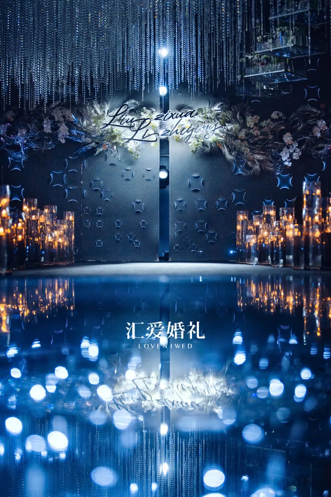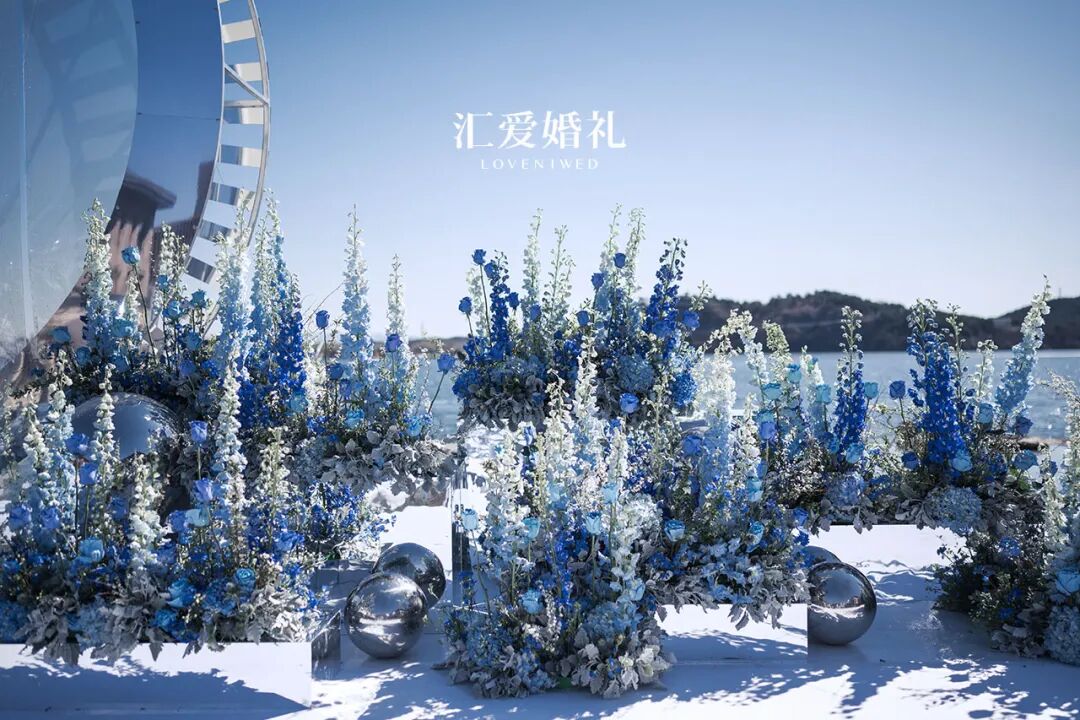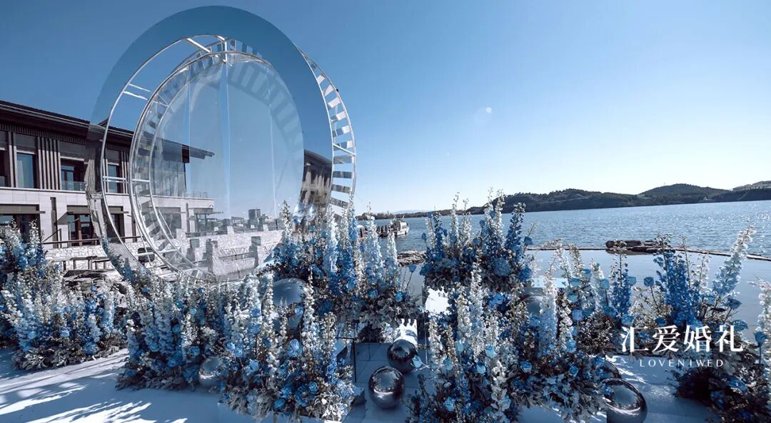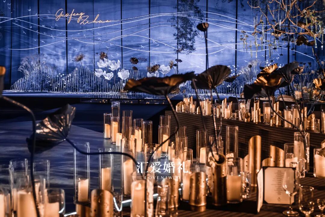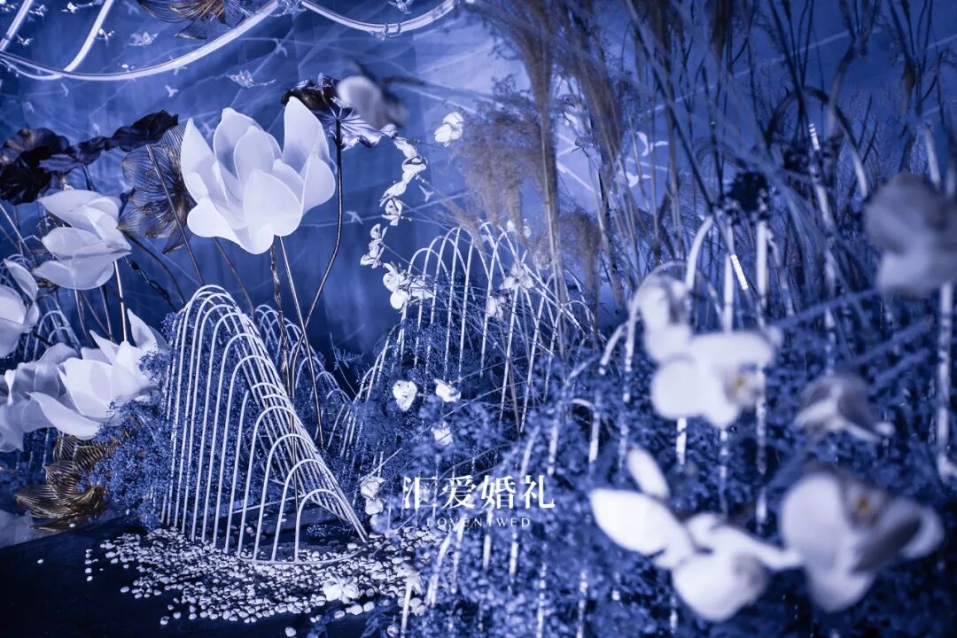 遵从新人的禅意本心,选自大自然中的天、水、石、莲、鸟、植,顺从色彩自然,流畅柔和的苍蓝色做底,至纯至白的花朵做眼,流萤闪烁烛光相伴,清透澄净。