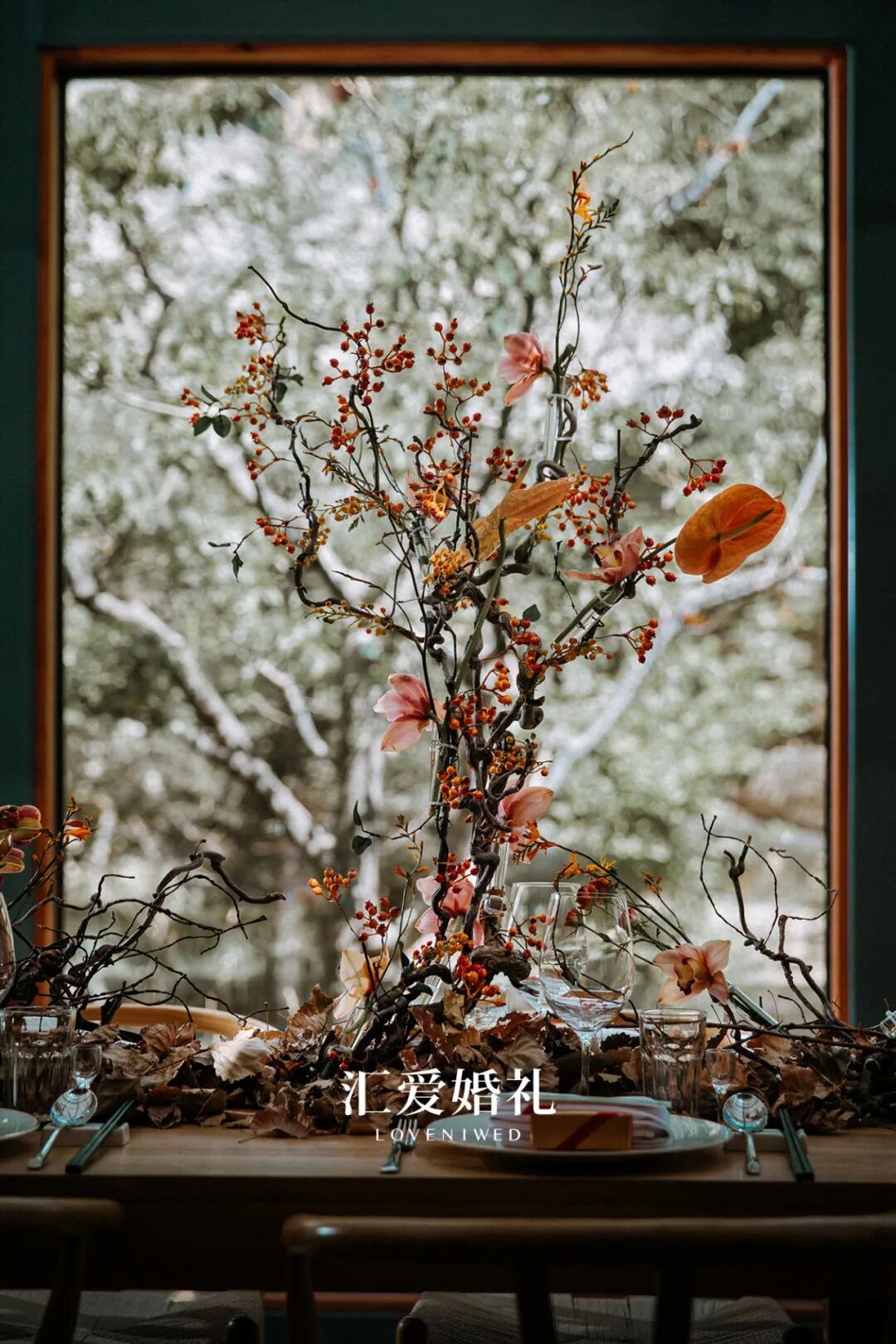 在充满禅意风格的素心餐厅里,花艺师选用龙枣枝,手工编织做一棵棵小树,将户外仪式区一片树林的设计构思带进室内,原木色的桌椅搭配蕙兰、杏色掌、浆果等花材,线条写意、色彩点缀,别有一番韵味。