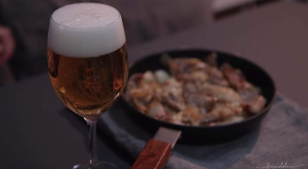午饭是简单的一人食,但不会忘记配上一杯啤酒。