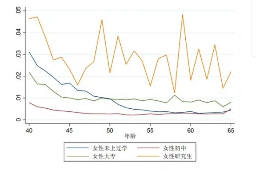 他统计了女性学历和未婚率之间的关系,发现硕士学历以上女性的不婚率,远远高于学历更低的女性。