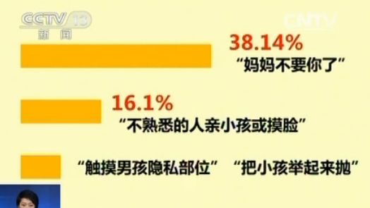 CCTV曾做过一个调查,最常见的逗小孩方式就是对孩子说:妈妈不要你了,高达38%;“不熟悉的人亲或摸脸”比例是16.1%;另外“把小孩举起来抛”和“触摸男孩隐私部位”也是很常见的方式。