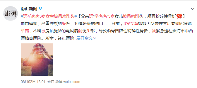 前段时间,同样有一位爸爸陪女儿玩举高高,3岁女儿却不小心被风扇削头;