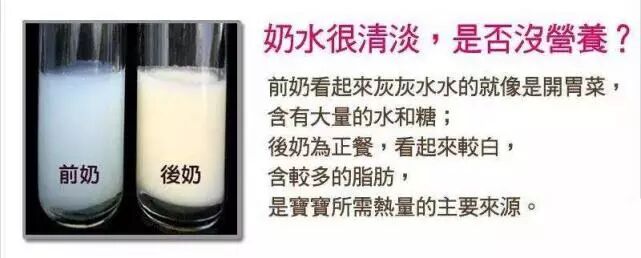 (3)“前奶”太清没营养,只喂后奶!先吸出来的奶叫“前奶”,虽然看上去比较稀薄,却富含蛋白质、乳糖、维生素、无机盐和水,主要功能就是为宝宝提供蛋白质、乳糖和解渴。这也让纯母乳喂养的宝宝,在出生后4个月内一般不需要额外补充水。