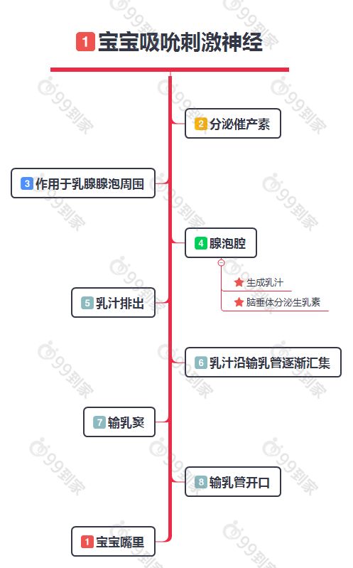 宝宝吮吸乳房,将信号传给大脑,制造乳汁的荷尔蒙又作用于乳房,促使乳腺挤压分泌出乳汁。这一系列动作连接起来,就是身体泌乳的机理。