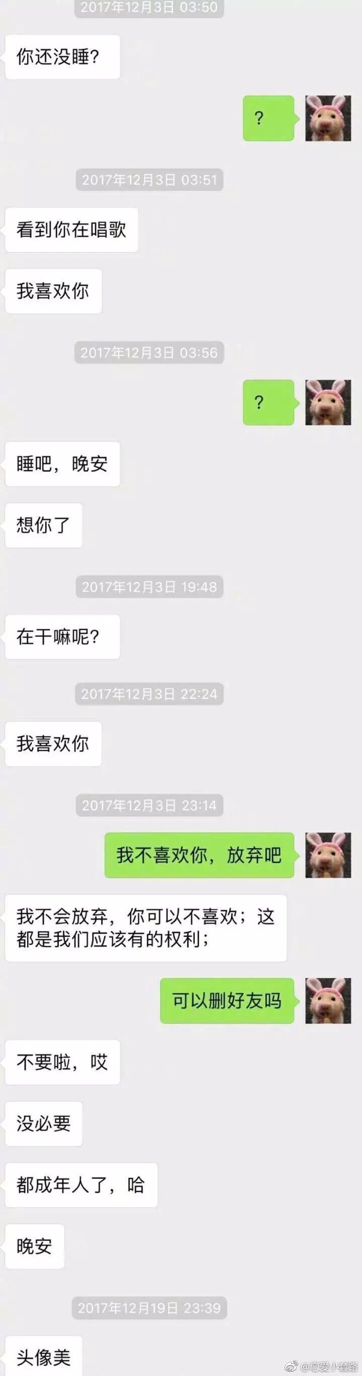 我向来不赞成死皮赖脸式的追求方式,首先,这种方式,追不到对方,甚至起到反作用,成功让她厌倦你,其次,可怜之人必有可恨之处,无休止的不断给不喜欢你的人弹消息,对她来说,可能是一种骚扰。再次,在跪舔过程中,你把姿态越放越低,即便得到了对方,你们的关系也是不对等的,迟早出问题,得不到就更惨了,丧失自信是一方面,被怼被嫌弃是一方面。