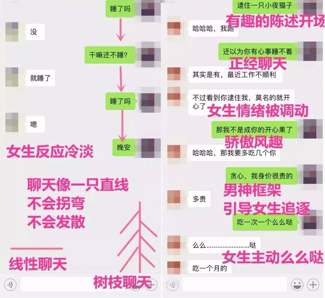 左边是直线聊天,效果极差,而右边以升级关系为主干,先后聊了夜猫子、开心果、心事、身价、等多个话题,聊天像树枝一样发散,同时加入男神框架+暧昧引导,不仅化解了女生不开心情绪,还成功让女生主动献吻。