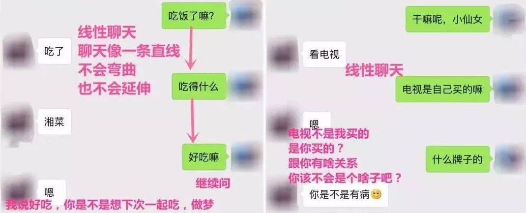 线性聊天即直线聊天,聊天像直线一样延伸下去,不会发散,不会拐弯,这种聊天优点是工作效率高,缺点是枯燥无聊,用它跟女生聊,不仅会让女生失去聊天兴趣,更会让女生有被监视窥探的感觉,女生当然反感你。