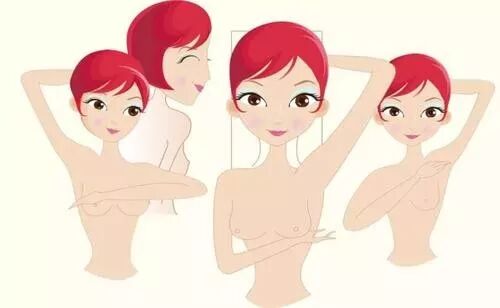 先看:沐浴后,镜前检查,双手叉腰,身体做左右旋转,观察双侧乳房是否对称,皮肤有无凹陷或橘皮样变化、乳头有无内陷。