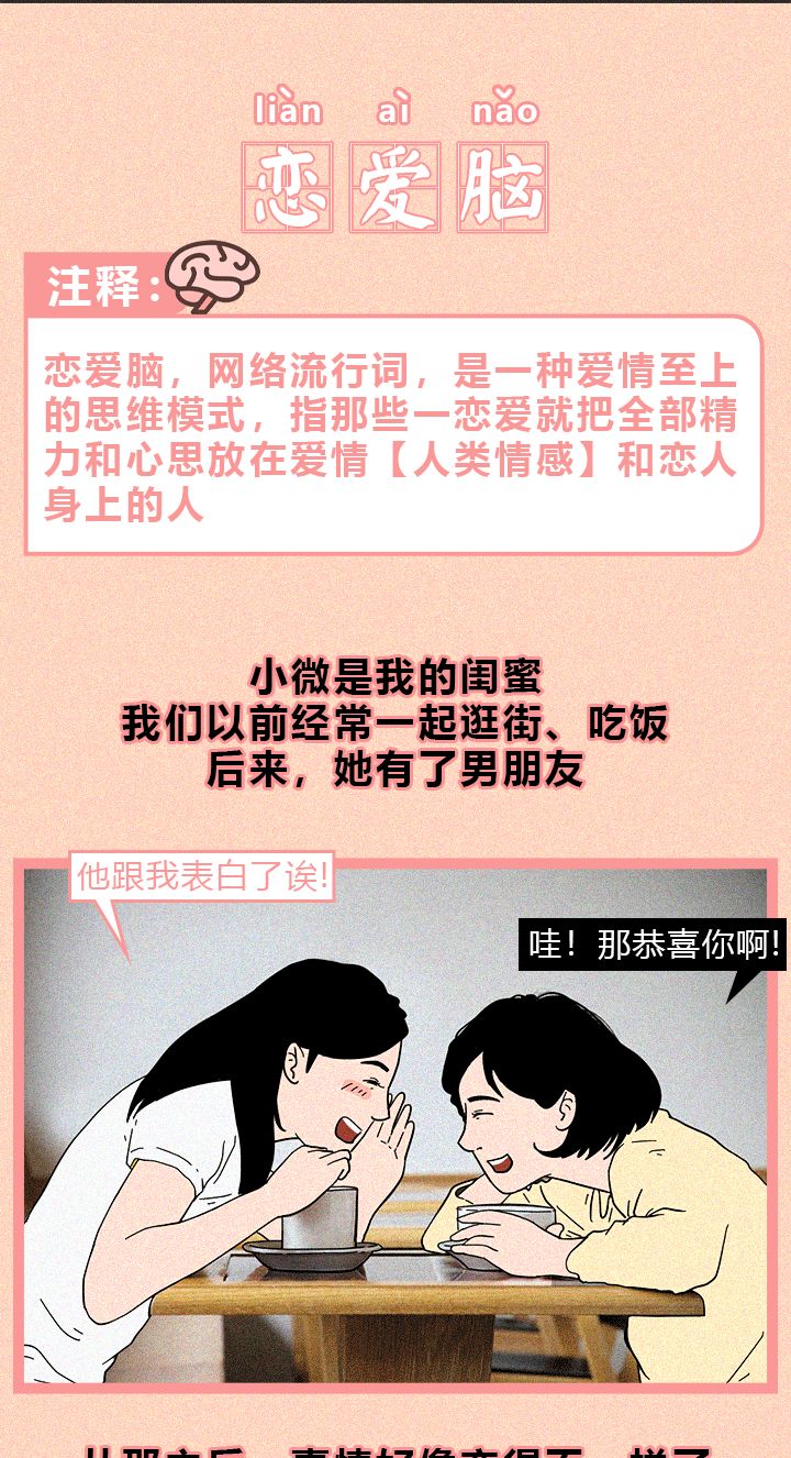 对于一谈恋爱就“上头”的人,最近有个网络流行语叫“恋爱脑”。有人将“恋爱脑”视为爱情的打开方式,但现实中很多情况可能要极端得多,一谈恋爱就真心付出,恨不得把自己掏空献给对方。为了爱情可以牺牲掉一部分工作和理想,甚至疏远朋友,冷落家人,因为心中认定对方就是自己人生中要相伴到老的最重要的人。